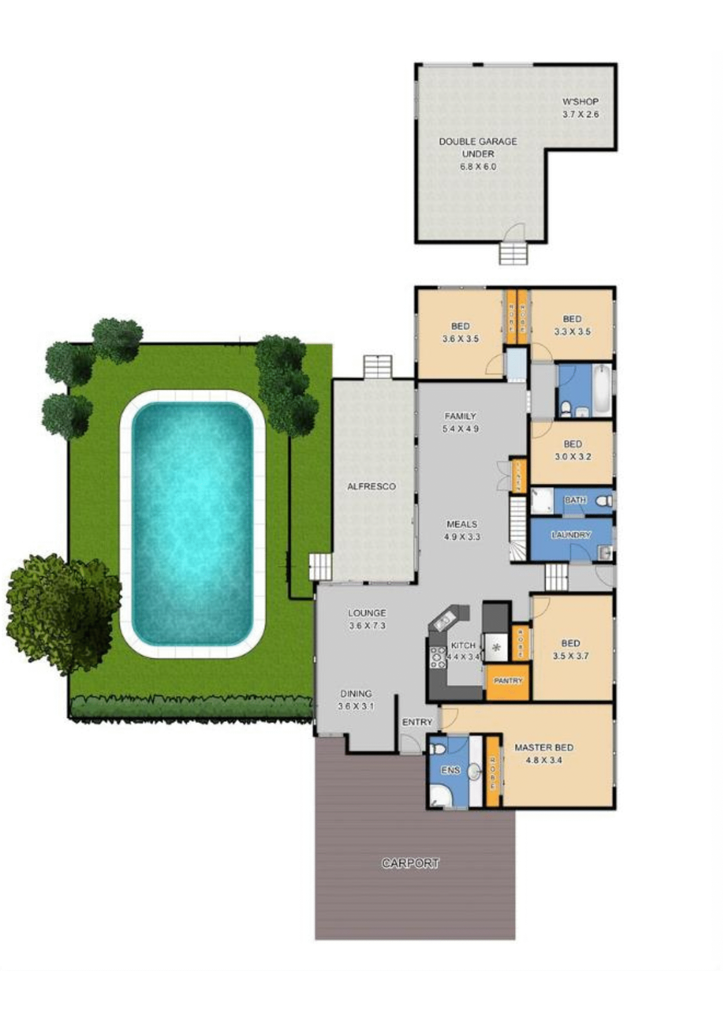 - Downstairs laundry with external access and third bathroom.